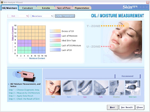 SkinSys皮肤诊测软件共有10大模块组成。能详细的添加和管理客户信息、产品门店信息。并能通过水油分析、纹理3D分析、角质层分析、斑点几乎分析和色素分析对皮肤进行一次完整详细的检测分析。分析结束后以直观彩色六角图和条状图重现上述分析结果,从而判断肌肤现状,再以护理报告形式给出最后结果。 |